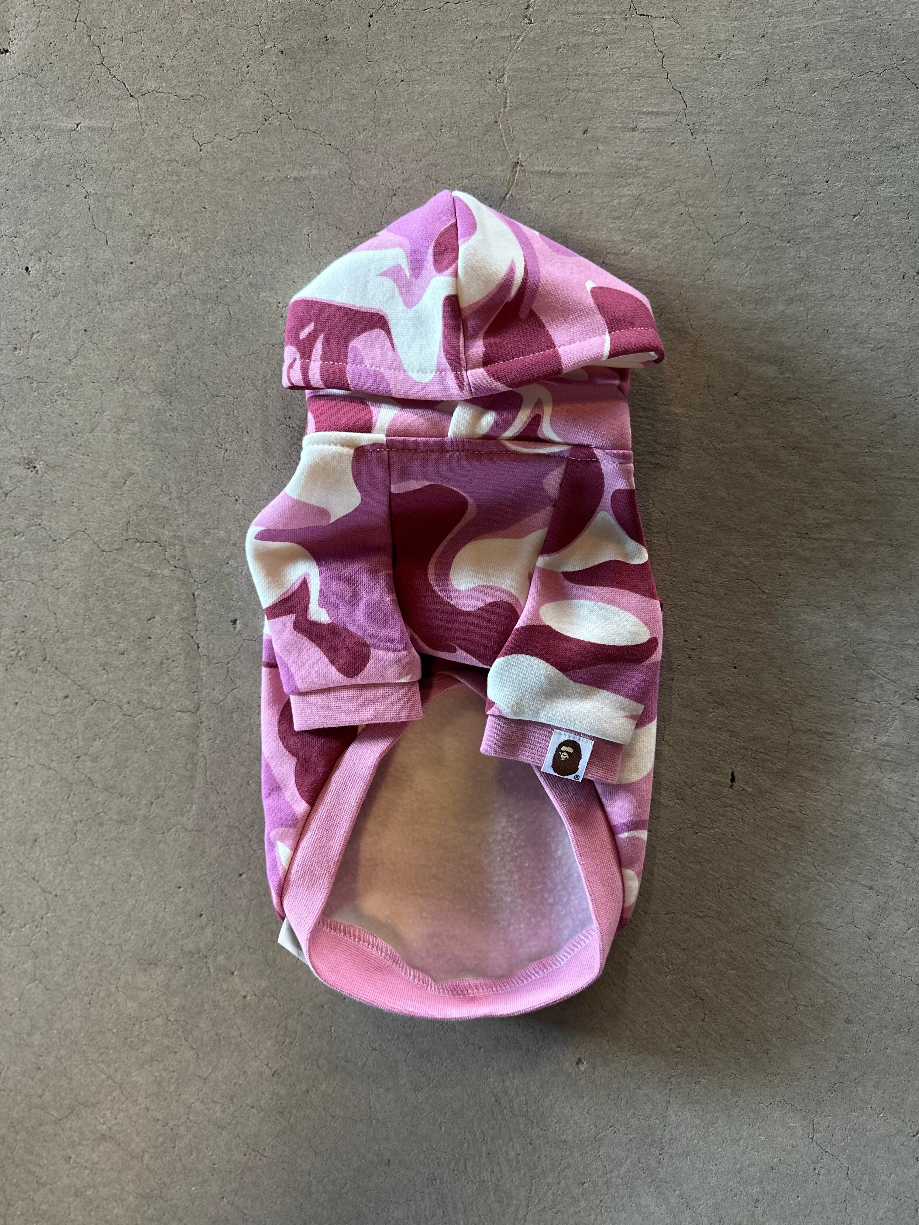 ベイプカモフラージュのインパクトと袖に施したエイプヘッドのピスネームがポイント。スウェット生地は軽さと柔らかさのある素材。フードの軽さを求めフード内側はスター柄のガーゼ素材を使用。フワッとした風合いのフォルムが可愛いく、ワンコにも負担のない着心地となっています。